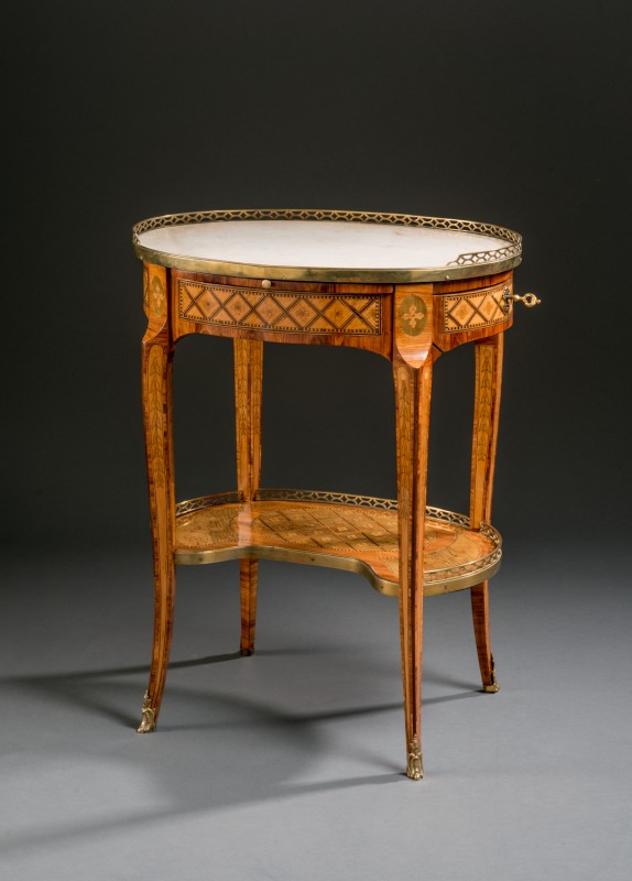 Ein "table en chiffonnière" ist ein kleines, leicht zu transportierendes Möbel, das gegen Ende des 18.Jahrhunderts sehr beliebt war. Der Name kommt von dem französischen Wort "chiffon", was ein Textil bezeichnet, auch weil er für die Dame des Hauses als kleiner Nähtisch eingesetzt wurde. In den Schubladen bewahrte man Nähzeug und Kurzwaren auf, Schleifen, Bänder und dergleichen mehr. Dieses Stück ist dem anderen Dusautoy-‐Tischchen sehr ähnlich und war offenbar ein Erfolgsmodell.