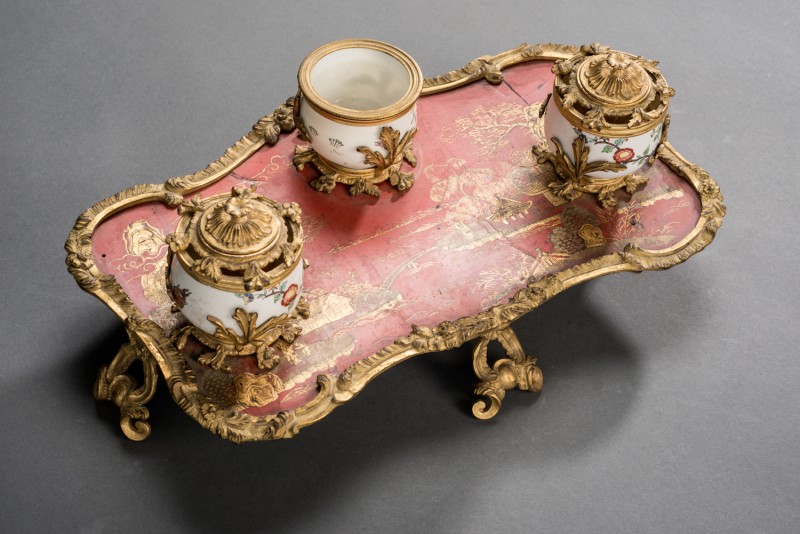 Rokoko und Chinoiserie verbinden sich in diesem Encrier (Tintenfassstand, Ständer für Farbbehälter). Die beiden Deckeldosen waren für Tinte oder Tusche, damit sie nicht so schnell verdunsteten, der offene Becher für den Lösch-Sand. Der Ständer ist eine Rotlack-Arbeit im chinesischen Geschmack (goût chinois), die Behältnisse sind aus Chantilly-Porzellan, einem Weichporzellan, das zwischen 1725 und 1800 in Chantilly (Oise, Picardie) hergestellt wurde. Der Dekor ist im japanischen Kakiemon-Stil und datiert die Gefäße in die Zeit zwischen 1725 und 1751, wofür auch die sehr weiße (Zinn-) Glasur spricht.