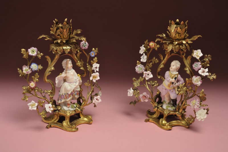 Solche aufwendigen Leuchten sind auch in Luxus- orientierten Epochen nicht sehr häufig. Der Dekor aus Porzellanblüten stammt aus Vincennes, die Figuren aus Meissen. Die Modelle wurden von J. J. Kaendler geschaffen (1706-1775), einem der berühmtesten Meissener Künstler. Das Rokoko bildete solch virtuosen Dekor aus und ließ Pflanzen gleichsam erblühen, so wie bei diesem bedeutenden Leuchterpaar. Man hat hier eine kunstvoll verzierte Laube reich dekoriert mit Porzelanblüten, ein Kunstobjekt mit praktischem Nutzwert.