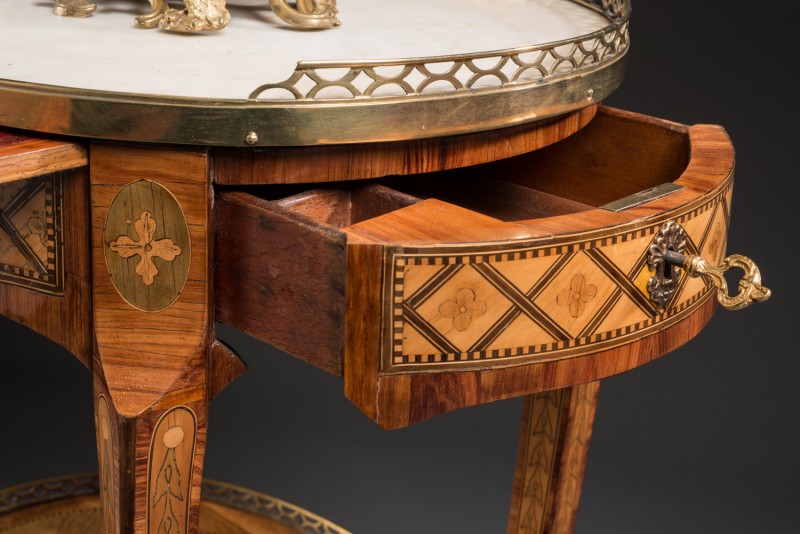 Ein "Table en chiffonnière" ist ein kleines, leicht zu transportierendes Möbel, das gegen Ende des 18.Jahrhunderts sehr beliebt war. Der Name kommt von dem französischen Wort "chiffon", was ein Textil bezeichnet, auch weil er für die Dame des Hauses als kleiner Nähtisch eingesetzt wurde. Dieser Typ war offenbar gefragt und schon in der Enstehungszeit sehr beliebt.