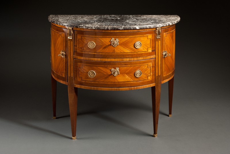 Diese Demi-Lune-Kommode weist in ihrer etwas strengeren Formauffassung schon auf klassizistische Möbel hin, vor allem durch die glatten, praktisch konisch zulaufenden Füsse mit quadratischem Querschnitt. Zwei Schübe und links und rechts je ein Kompartment hinter einer im Viertelkreis gebogten Tür sorgen für einen symmetrischen Aufbau.