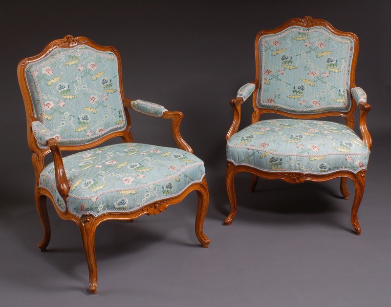 Das hier angebotenen Sesselpaar (Armlehnstuhl) - vergleiche Pierre Kjellberg, "Le Mobilier Francais du XVIII Siècle" s.603 ff - aus geschnitztem Nussbaum löst die tragenden Elemente des Sesselrahmens in ornamental geschwungene Formen auf, mit einem Zusatzpolster auf der Armlehne wird der Komfort erhöht, was einen Ersatz für den Verzicht auf Rundumpolsterung darstellt. Die Holzrahmensessel sind leichter und beweglicher als ein Polstersessel, konnten auch in größerer Zahl etwa an Tische oder als auch weil Sitzfläche und Rückenlehne nicht miteinander verbunden sind.Gruppen für Zuhörer, etwa bei Konzerten, aufgestellt werden.