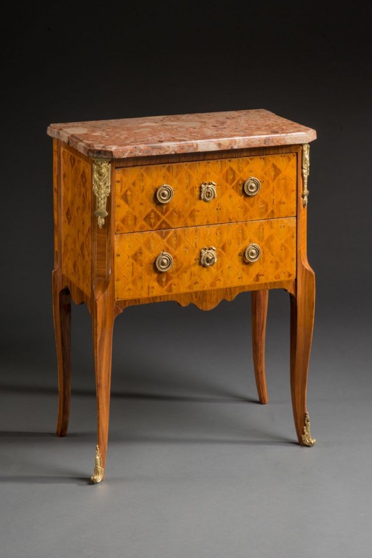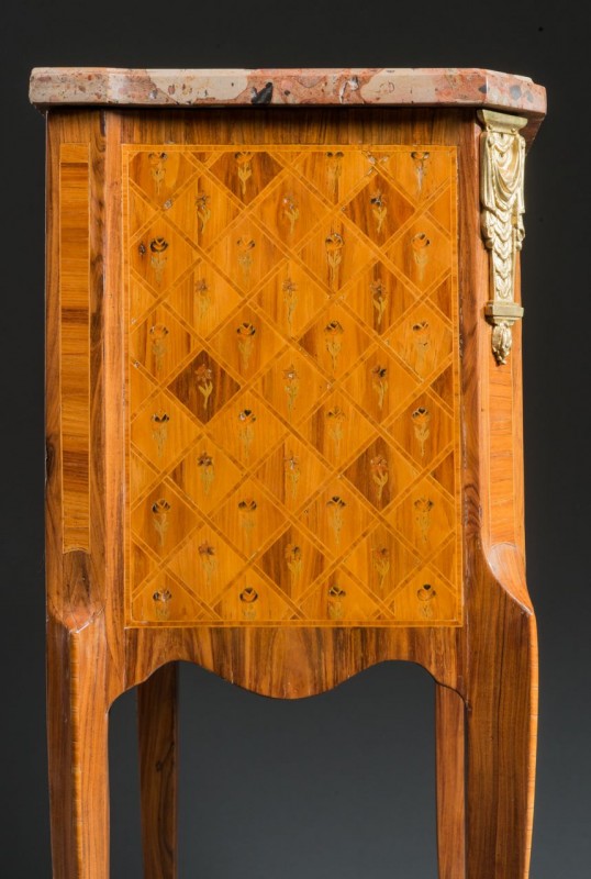 Eichenkorpus mit feiner Rauten- und Blumenmarketerie, graviert und teilweise koloriert, originales Schloss und originale Beschläge, Steinplatte in „Brèche d‘Alep“