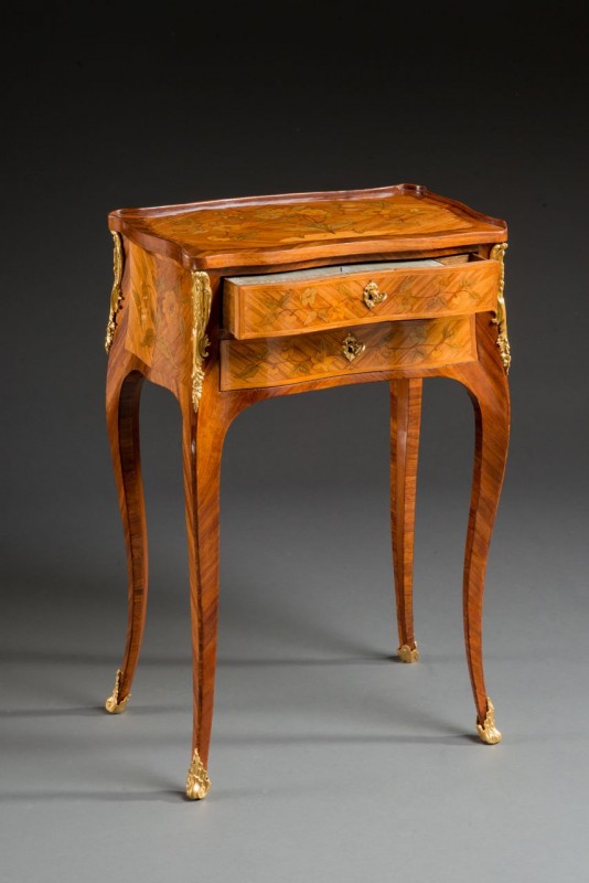 Der allseitig geschweifte Salontisch, leicht, zierlich und hochelegant, ist ein Meisterwerk des Adrien Delorme (1722-1791), und ein charakteristisches Möbel im Stil Louis XV. Bestimmungsgemäss zeigt er zwei Schubfächer zur Aufnahme diverser Utensilien, die Tafel hat einen erhöhten Rand, damit die meist kleineren Gegenstände, mit denen an dem Tisch hantiert wurde, nicht so leicht zu Boden fallen konnten. Eine großzügige Blumenmarketerie, zum Teil koloriert, verleiht dem Werk eine eher weibliche Note, was stimmig ist, da diese universell einsetzbaren und schnell transportierbaren Tische vorwiegend von den Damen des Hauses benutzt wurden.