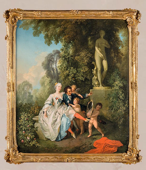 Der Künstler Christian Wilhelm Ernst Dietrich, auch Christian Guillaume Ernest Dietricy (es gibt eine Variante auch mit „i“), gehört als einer der umfassendsten Maler, Radierer und Kupferstecher seiner Zeit zur ersten Garde der europäischen Kunstschaffenden. Umfassend in Tech- nik wie in Thematik, fand er sehr bald zu eigenständigen Formulierungen, nachdem er zunächst dem Vorbild der Alten Meister gefolgt war. Er pflegte auch eine gewisse Nähe zu Watteau (1684 - 1721), und das vorliegende Bild ist dafür ein Zeugnis.Eine lebendig komponierte Figurengruppe um eine Stein- bank herum belebt eine durch eine Venusstatue im vorderen Hintergrund als herrschaftlich definierte Park- landschaft. Die Figuren bilden eine mittig gesetzte, fast schon quirlige Gruppe, bestehend aus einer vornehmen Dame, die den Betrachter anschaut, einem Galan und drei Kinderfiguren, die durch ihre „paradiesische“ Nackt- heit als Amoretten bestimmt sind. Der Galan zeigt auf die Skulptur, und vermittelt das der rechten Amorette, die der Dame einen Spiegel hinhält. Die mittlere Amo- rette zeigt auf die Dame, die Amorette, die dem Galan über die Schulter lugt, macht auf den Spiegel aufmerksam: Es geht, so zu sagen in einer Art Reigen, um den „Spiegel der Venus“, das Symbol der Sinnlichkeit und der Weib- lichkeit. Mit James Joyce (aus „Finnegans Wake“, 90.20- 22) zu reden: “He is not eluding from the whole of the woman.” Thema ist hier ohne Zweifel eine amouröse Begegnung in der freien Natur, das eine leichte Variante einer seit dem klassischen griechischen Altertum ge- pflegten erotischen Ikonographie zeigt (die ursprünglich auch in Rembrandts „Judenbraut“ vorhanden war). Der Spiegel steht natürlich auch für die Eitelkeit ein.Das Thema gehört zu den weiland überaus beliebten, und es spiegelt in einer unbeschwerten Weise die Lebenssituation der führenden gesellschaftlichen Schichten der Zeit wider. Es ist das Lebensgefühl einer Welt, die in den Wirren der Französischen Revolution unterging. Von dieser hat Talleyrand einmal gesagt, dass derjenige, der sie nicht gekannt habe, nicht ermessen könne, was die Süße des Lebens sei. Das hemmungslos hedonistische Lebensgefühl dieser Zeit ist heute weitgehend verschwunden. Die historischen Zeugnisse eines gesteigerten Lebensgenusses reflektieren auch damalige zeitgenössische Träume, ohne eine „Ersatz“-Funktion für sich zu reklamieren. Man muss aber auch sehen, dass es so etwas heute in Teilbereichen noch gibt, nur nicht in der hoch kultivierten, beinahe ritualisierten Form früherer Zeiten. Da war Lebensgenuss der Kultur zugehörig, was man von heutigen Ausschweifungen nur eher selten behaupten möchte.Das Bild ist von der Gattung her mehrstimmig, hier mischen sich die Pastorale (ländliche Idylle, „Schäferstündchen“) und die fête champêtre (ausschweifende Feier in ländlicher Umgebung) mit symbolischen und allegorischen Figuren. Die Sicht in die Ferne in der linken Bildhälfte ist in dieser Zeit häufig anzutreffen, er weitet das Bildgeschehen, das einen universellen Aspekt bekommt („Così fan tutte“...).