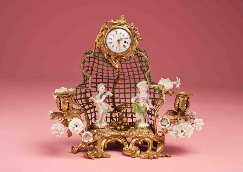 Hier haben wir es mit einer opulenten Rokoko-Extravaganz zu tun. Das Halteteil ist eine Art Baumstamm, der aus einem Fantasiesockel wächst, flankiert von zwei Kerzenhaltern, ausgestattet mit Blumendekor aus Vincennes und einer Gartenlaube in Lattengeflecht mit Meissener Porzellanfiguren.