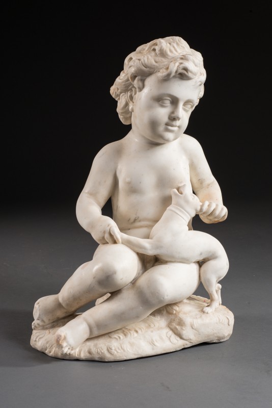 Dies ist ein charakteristisches Beispiel für die Kunst der Brüder Broche, die jeder auch für sich einen hervorragenden Ruf als Bildhauer genossen. Typisch ist, dass sie keine Einzelfigur zeigen (die es allerdings gibt), sondern eine Gruppe. Es ist ein Knabe/Putto, der auf einem Rasenstück sitzt und seinen kleinen Hund (mit Halsband) dabei hat, mit dem er gerade spielt. Er zieht ihn ein wenig an den Ohren, was nicht unbedingt strafend gemeint sein muss. Das wird durch die auffällige Gruppierung nahe gelegt, da ja Tausend andere Varianten der dann weniger besonderen Zuordnung denkbar sind.