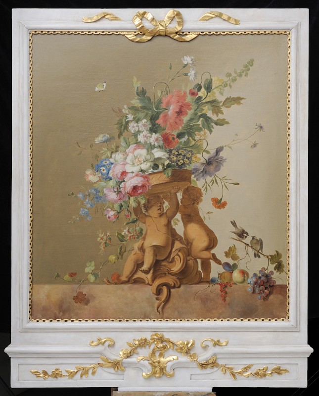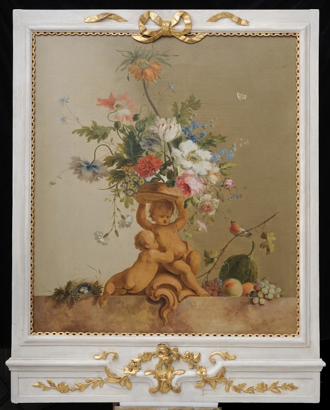 Die Tafeln sind hier in weiß gefasst und mit vergoldetem Schleifen- und Pflanzendekor versehen. Die in Öl auf Leinwand ausgeführten Gemälde zeigen Putti, die auf Voluten auf einem Architekturteil sitzend Schalen mit Pflanzen halten. Sie werden von weiteren Accessoires wie Vogelnestern und Früchten sowie Vögeln begleitet.