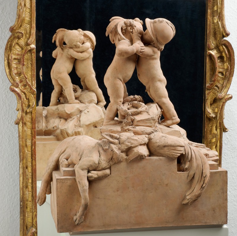 Die Zweifigurengruppe „Französisch-Italienische Allianz” entstand vor der Folie historischer Ereignisse und wurde für einen gewichtigen Anlass geschaffen, der sie in das Jahr 1916 datierbar macht. Gedacht war sie als imposanter Surtout de table. Als solcher schmückte die Gruppe die Gala-Tafel anlässlich des Besuches des italienischen Oberbefehlshabers und Marschall Graf Luigi Cardona, der 1916 nach Paris kam. Italien hatte sich im Vorfeld des Ersten Weltkrieg zunächst für die Seite der Mittelmächte entschieden, trat aber im Mai 1915 mit der Entente gegen Österreich-Ungarn und Deutschland in den Krieg ein. Damit stand Italien nun auf Seiten des Vereinigten Königreich, Russland und eben auch Frankreich. Diese neue Allianz Italiens ist Thema der Figurengruppe von Max Blondat, umgesetzt in einer figürlichen Komposition mit militärischen Attributen, allegorischen und mythologischen Einzelmotiven. Unter den Siegeskränzen auf dem getreppten Piedestal liegt zur Linken die kapitolinische Wölfin als Symbol für Italien, zur Rechten der gallische Hahn für Frankreich. Darüber inszenierte Blondat einen „Bruderkuss” zweier Putten, von denen der Linke mit dem Federhut für die italienische Infanterie steht, der rechte behelmte für das französische Heer.