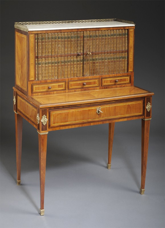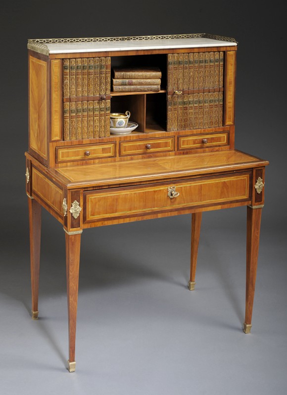 Dieses Exemplar des Pariser Ebenisten Jean-Charles Saunier brilliert mit einer raffinierten Trompe-l´œil–Architektur im Aufsatz: Die fein aneinander gestellten Buchrücken lassen sich durch einen Schiebemechanismus in die Tiefe des Korpus bewegen und zum Vorschein kommt ein reich gegliedertes Innenleben mit Fächern und Regalen. Das elegante Möbel wird von einer Marmorplatte mit Galerie abgeschlossen. Der Schöpfer des Möbels ist Jean-Charles Saunier, der Vater von Claude Charles Saunier, dessen Unternehmen durch den Sohn auf der Rue de Faubourg-Saint-Antoine weitergeführt und vergrößert wurde.