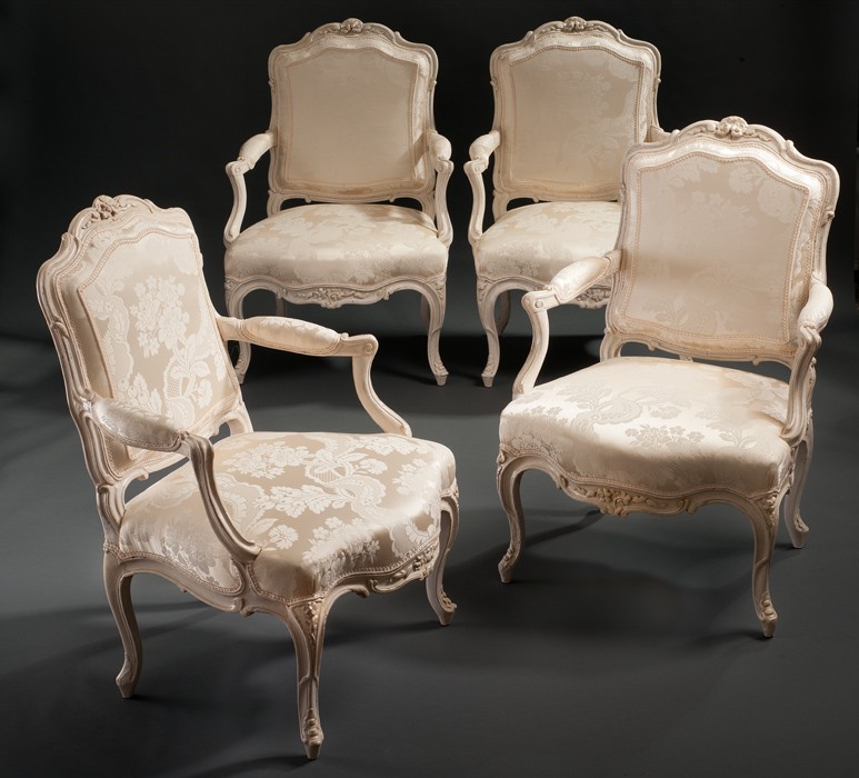 1750 war noch die Zeit vor dem Aufkommen des (Neo-)Klassizismus. Der Stil LouisXV regierte ungebrochen, geradezu konkurrenzlos, und strahlte auch über die Grenzen Frankreichs hinaus. Aus dieser Zeit stammen die vier Buchenholzsessel (Buche ist ein strapazierfähiges Hartholz), deren alte Fassung noch erhalten ist. Sie haben Armlehnen, was vor allem den Komfort dient, aber auch ein hervorhebendes Merkmal sein kann, vor allem, wenn das Sitzmöbel zusammen mit ähnlichen solchen gruppiert wird, die keine Armlehnen haben.