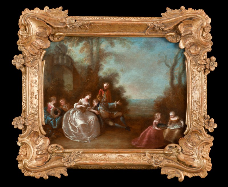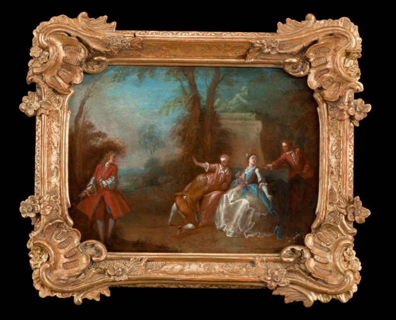 Die Galanten Szenen sind die kleinere, intimere Variante der Fête champêtre, mit der sie viel es gemein haben. Sie verarbeiten Motive aus den gängigen Werken zur Liebeskunst der Zeit (und ihrer klassischen Vorbilder, etwa Ovids „Ars amatoria“) etwa die „Gefährlichen Liebschaften“ von Choderlos de la Clos, 1782, oder Werke von Claude-Prosper Jolyot de Crébillon (1707-77), Jean-Baptiste Louvet de Couvray (1760-97), Nicolas Edme Restif de la Bretonne (1734-1806). Motive aus Literatur und Leben kommen in solchen intimen Szenen zusammen, die fast immer darum kreisen, dass ein Mann versucht, eine Dame für sich zu gewinnen. Mit ausladender Geste spricht der Kavalier zur Dame, was seine großen Versprechungen versinnbildlicht, aber nicht immer ist den Bemühungen bekanntlich Erfolg beschieden: Auch wenn der Herr sich der Dame zu Füßen wirft kann er doch auch abgewiesen werden.