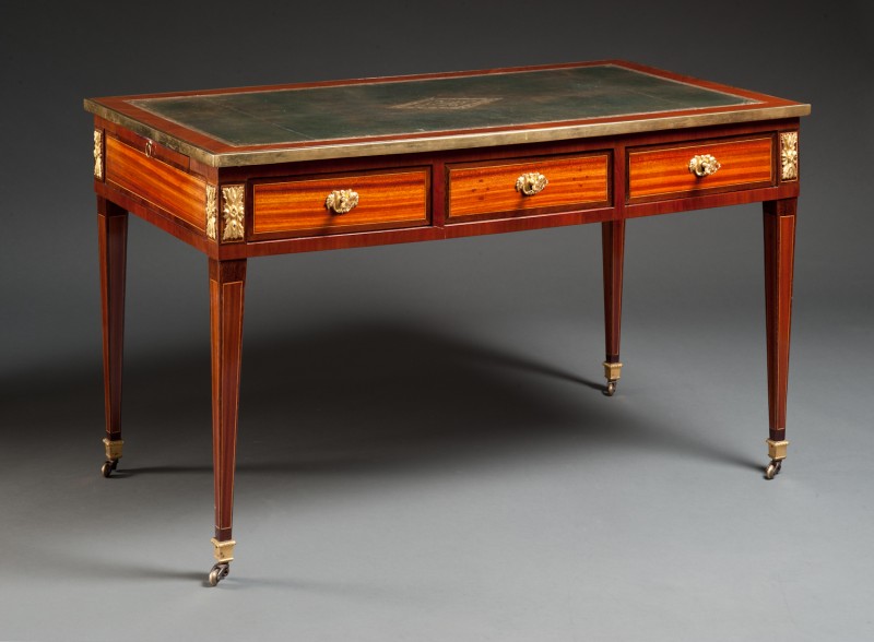 Das „bureau plat“ (flacher Schreibtisch) gehörte zu den häufigsten Aufgaben für Kunsttischler. Auch die größten Meister ihrer Zunft haben sie hergestellt, so wie etwa Johann Heinrich (Jean-Henri) Riesener (1734 Gladbeck – 1806 Paris) den berühmten Schreibtisch für Marie-Antoinette (1783) im kleinen Königinnensalon in Versailles (Petit appartement de la reine).